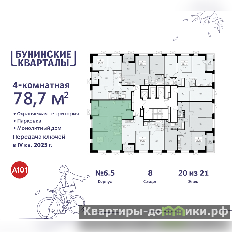 Квартира находится в корпусе 6.5. Дом монолитный, одноподъездный, высотой 21 этаж. На этаже 9 квартир. В подъезде 1 пассажирский и 2 грузовых лифта. Начало строительства - 3 квартал 2023 года. Окончание строительства - 4 квартал 2025 года. Оформление сделки по договору долевого участия.