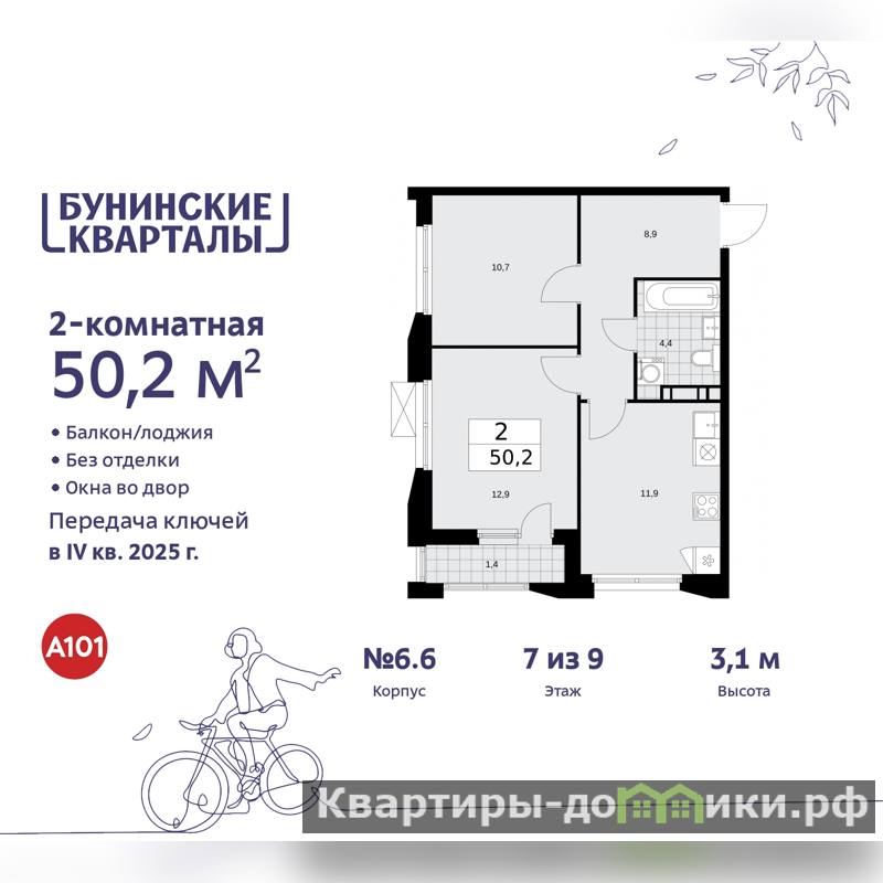 Двухкомнатная квартира бизнес-класса в ЖК "Бунинские кварталы" на 7 этаже. Квартира без отделки, после выдачи ключей можно делать ремонт. Общая площадь: 50.2 кв.м., жилая: 23.6 кв.м., площадь просторной кухни-столовой: 11.9 кв.м. Квартира угловая, идеально подойдет любителям тишины и панорамных видов. В квартире одна лоджия, один совмещенный санузел. Высота потолков 3.1 м.