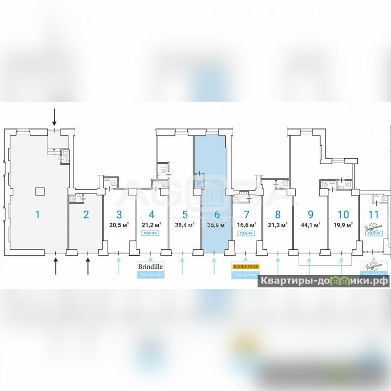 Первая линия, отличная видимость, интенсивный пешеходный трафик от 1500 чел/час. Густонаселенный район с развитой инфраструктурой и сложившимся торговым окружением. Помещение общей площадью 35,9 кв.м (блок № 6 на плане) расположено на 1-м этаже жилого дома. Высота потолков - 4,5 м, зальная планировка, отдельный вход с фасада, В помещении выполнен капитальный ремонт. Объект № 549075Номер объекта: #51/549075/310