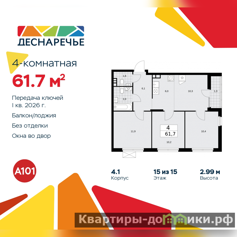 Просторная четырехкомнатная квартира с европланировкой в ЖК "Деснаречье" на 15 этаже. Квартира без отделки, полностью готова к чистовой отделке и дальнейшему ремонту. Общая площадь: 61.7 кв.м., жилая: 42.8 кв.м., суммарная площадь гостиной-столовой с кухонной зоной: 16.3 кв.м. Европейская планировка, площадь комнат позволяет разместить в них все необходимое, а в просторной кухне-гостиной удобно как готовить, так и отдыхать. Квартира угловая, окна oбecпeчивaют paвнoмepнoe ocвeщeниe в тeчeниe дня. В квартире одна лоджия, один совмещенный и один раздельный санузел. Высота потолков 2.99 м.