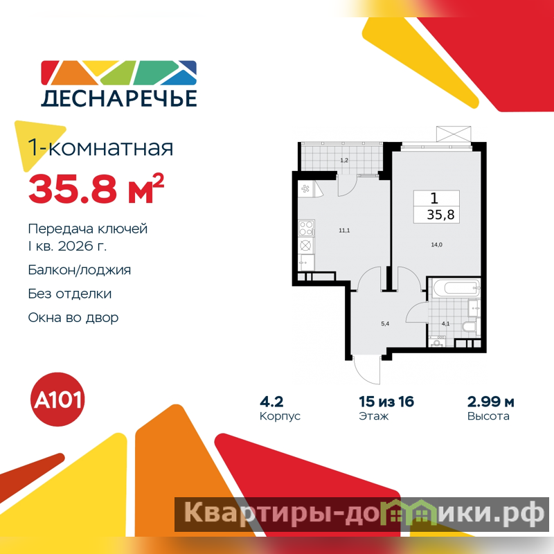 Продается однокомнатная квартира в ЖК "Деснаречье" на 15 этаже. Квартира без отделки, после оформления собственности можно делать ремонт. Общая площадь: 35.8 кв.м., жилая: 14 кв.м., площадь просторной кухни-столовой: 11.1 кв.м. Все окна выходят на одну сторону. В квартире одна лоджия, один совмещенный санузел. Высота потолков 2.99 м.