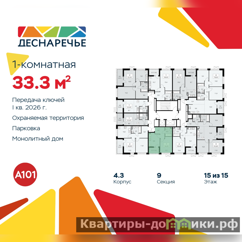 Квартира находится в корпусе 4.3. Дом монолитный, одноподъездный, высотой 15 этажей. На этаже 10 квартир. В подъезде 1 пассажирский и 1 грузовой лифт. Начало строительства - 3 квартал 2023 года. Окончание строительства - 1 квартал 2026 года. Оформление сделки по договору долевого участия.