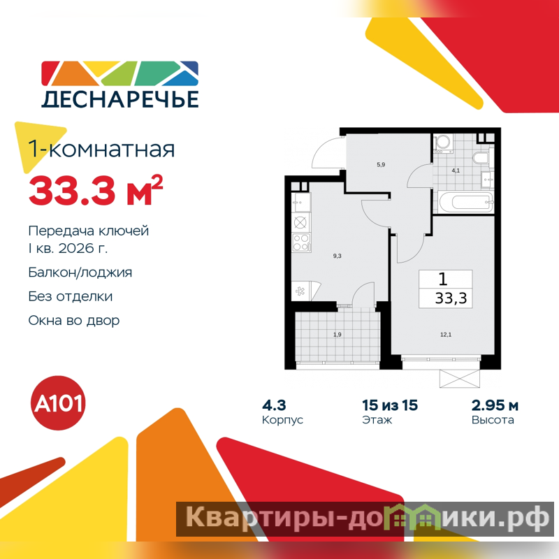 Однокомнатная квартира от застройщика в ЖК "Деснаречье" на 15 этаже. Квартира без отделки, после оформления собственности можно делать ремонт. Общая площадь: 33.3 кв.м., жилая: 12.1 кв.м., площадь просторной кухни-столовой: 9.3 кв.м. Все окна выходят на одну сторону. В квартире одна лоджия, один совмещенный санузел. Высота потолков 2.95 м.