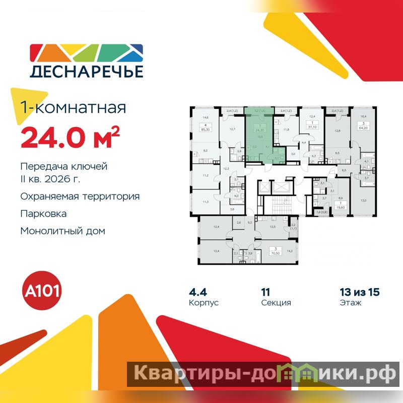 Дом монолитный, черырехподъездный, высотой 15 этажей. Квартира находится во 2-й секции в корпусе 4.4. На этаже 6 квартир. В подъезде 1 пассажирский и 1 грузовой лифт. Начало строительства - 3 квартал 2023 года. Окончание строительства - 2 квартал 2026 года. Оформление сделки по договору долевого участия.
