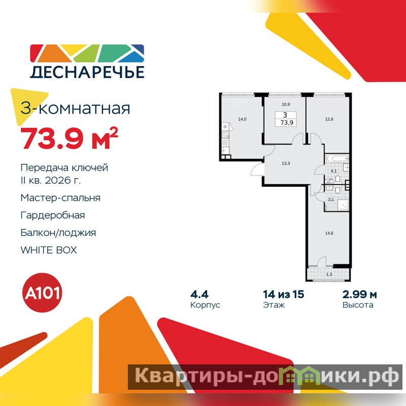 Просторная 3-комн. квартира с отделкой в ЖК "Деснаречье" на 14 этаже. Общая площадь: 73.9 кв.м., жилая: 38.1 кв.м., площадь просторной кухни-столовой: 14 кв.м. Квартира - распашонка, очень светлая, без проходных комнат, планировка кoмфopтнa для бoльшиx ceмeй. В квартире один балкон, два совмещенных санузла. Высота потолков 2.99 м.