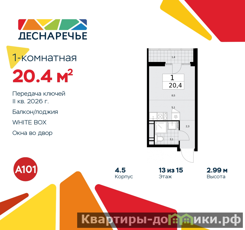 1-комн. квартира-студия с отделкой в ЖК "Деснаречье" на 13 этаже. Общая площадь: 20.4 кв.м., площадь гостиной 13.6 кв.м., из которых 5.1 кв.м. выделено под кухонную зону. Все окна выходят на одну сторону. В квартире один балкон, один совмещенный санузел. Высота потолков 2.99 м.