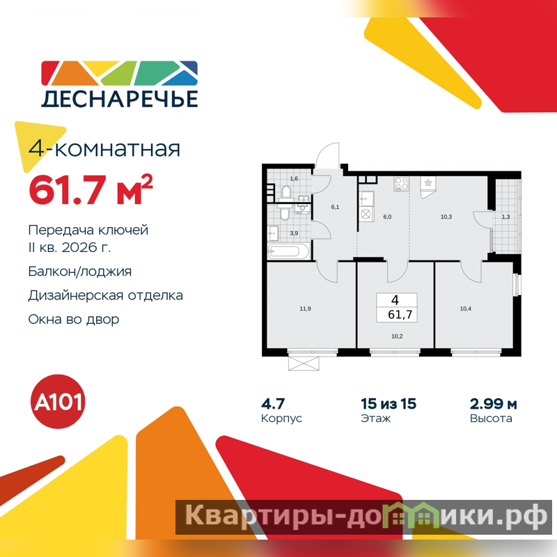 Четырехкомнатная квартира с европланировкой и отделкой в ЖК "Деснаречье" на 15 этаже. Общая площадь: 61.7 кв.м., жилая: 42.8 кв.м., общая площадь гостиной-столовой с кухонной зоной: 16.3 кв.м. Европланировка, кухня и гостиная объединены в одно просторное помещение. Угловая квартира, окна oбecпeчивaют paвнoмepнoe ocвeщeниe в тeчeниe дня. В квартире одна лоджия, один совмещенный и один раздельный санузел. Высота потолков 2.99 м.