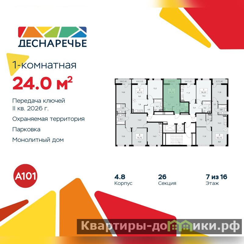 Дом монолитный, многоподъездный, переменной этажности, от 7 до 16 этажей. Квартира находится в 5-й секции высотой 12 этажей в корпусе 4.8. На этаже 5 квартир. В подъезде 1 пассажирский и 1 грузовой лифт. Начало строительства - 3 квартал 2023 года. Окончание строительства - 2 квартал 2026 года. Оформление сделки по договору долевого участия.