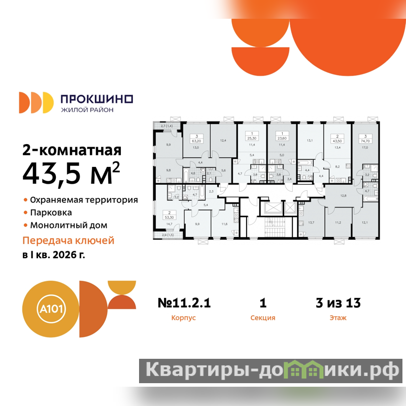 Дом монолитный, черырехподъездный, высотой 13 этажей. Квартира находится в 1-й секции в корпусе 11.2.1. На этаже 6 квартир. В подъезде 1 пассажирский и 1 грузовой лифт. Начало строительства - 3 квартал 2023 года. Окончание строительства - 1 квартал 2026 года. Оформление сделки по договору долевого участия.