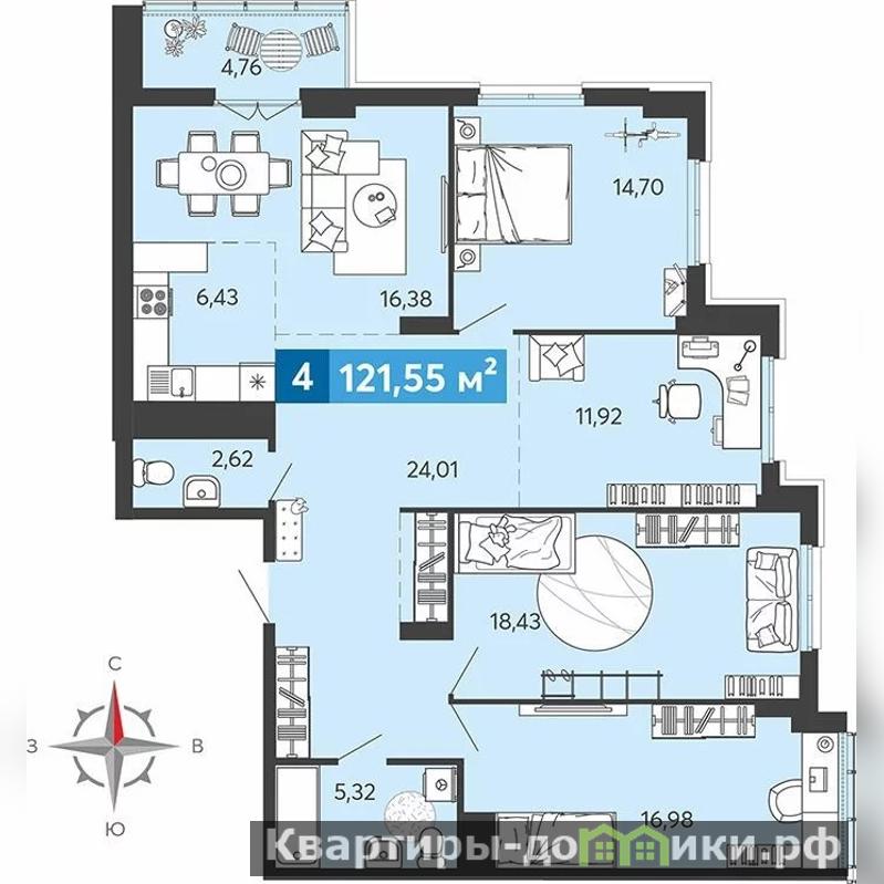 Общая площадь 121,55кв.м. , жилая площадь 78,41кв.м., кухня 6,43кв. м. , 2 сан узла , лоджия 4,76кв.м. . Имеется выбор этажей и планировок .