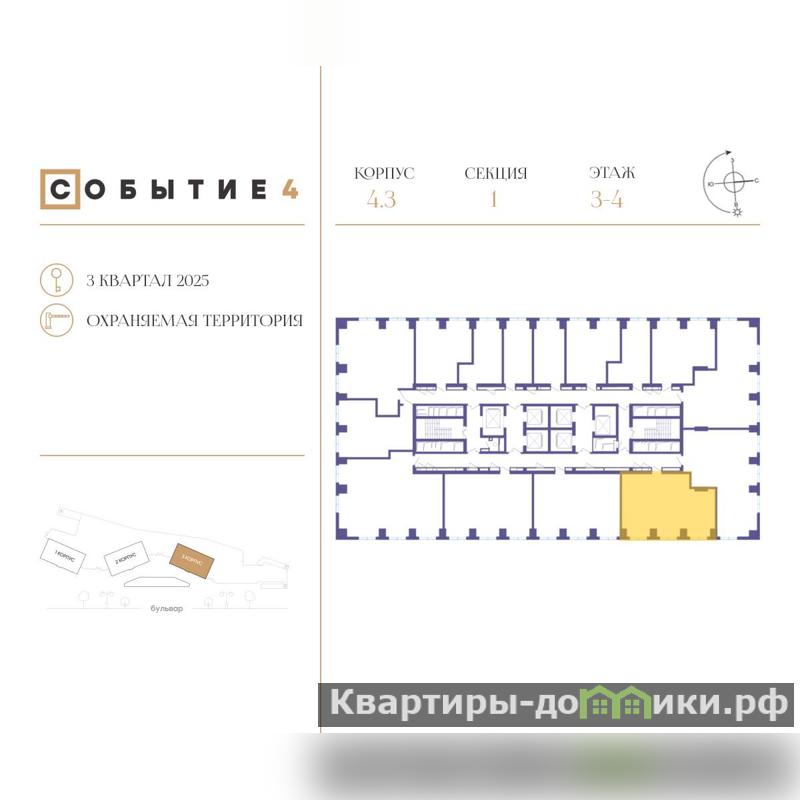 Квартира расположена в квартале 4, в корпусе 3 (секция 1) . В каждом подъезде запроектировано 5 квартир на этаж, есть пассажирский и грузовой лифты.