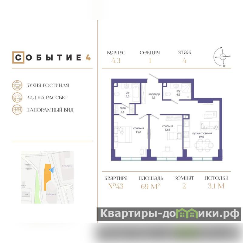 Продается 2-комн. квартира в ЖК Событие на 4-м этаже. Общая площадь лота составляет 69.00 кв. м, из которых 19.60 кв. м отведено под просторную кухню-гостиную. 2 совмещенных санузла.