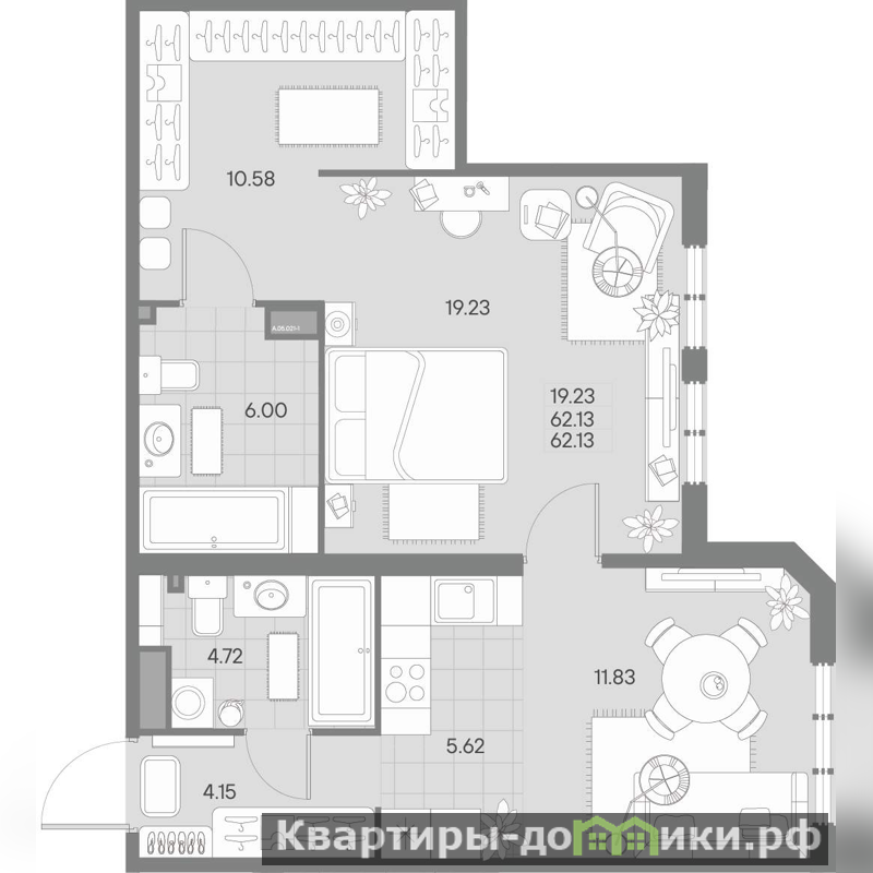 Жилая площадь 19.23 м2, кухня 5.62 м2, черновая отделка.