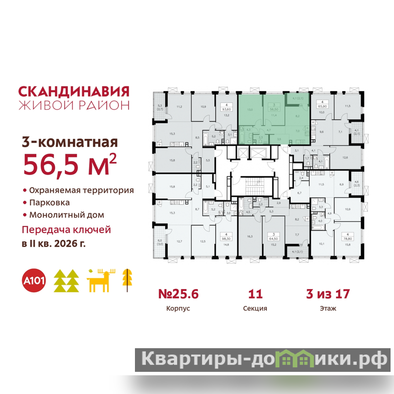 3-комн. квартира бизнес-класса с европланировкой в ЖК "Скандинавия" на 3 этаже. Квартира без отделки, после получения ключей можно делать ремонт. Общая площадь: 56.5 кв.м., жилая: 32.6 кв.м., суммарная площадь гостиной-столовой с кухонной зоной: 15.2 кв.м. Европейская планировка, зона гостиной комнаты объединена с кухней. Комнаты изолированные, все окна выходят на одну сторону. В квартире одна лоджия, один совмещенный и один раздельный санузел. Высота потолков 3.1 м.