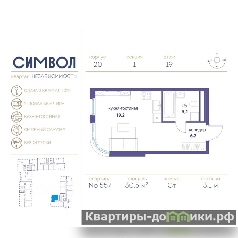 Продается однокомнатная квартира-студия в ЖК "Символ" на 19 этаже. Квартира без отделки, новый собственник может сделать ремонт по индивидуальному проекту. Общая площадь: 30.5 кв.м., площадь гостиной 24.2 кв.м., из которых 5 кв.м. выделено под кухонную зону. Угловая квартира, очень светлая, естественная вентиляция при открытии окон. В квартире один совмещенный санузел. Высота потолков 3.1 м.