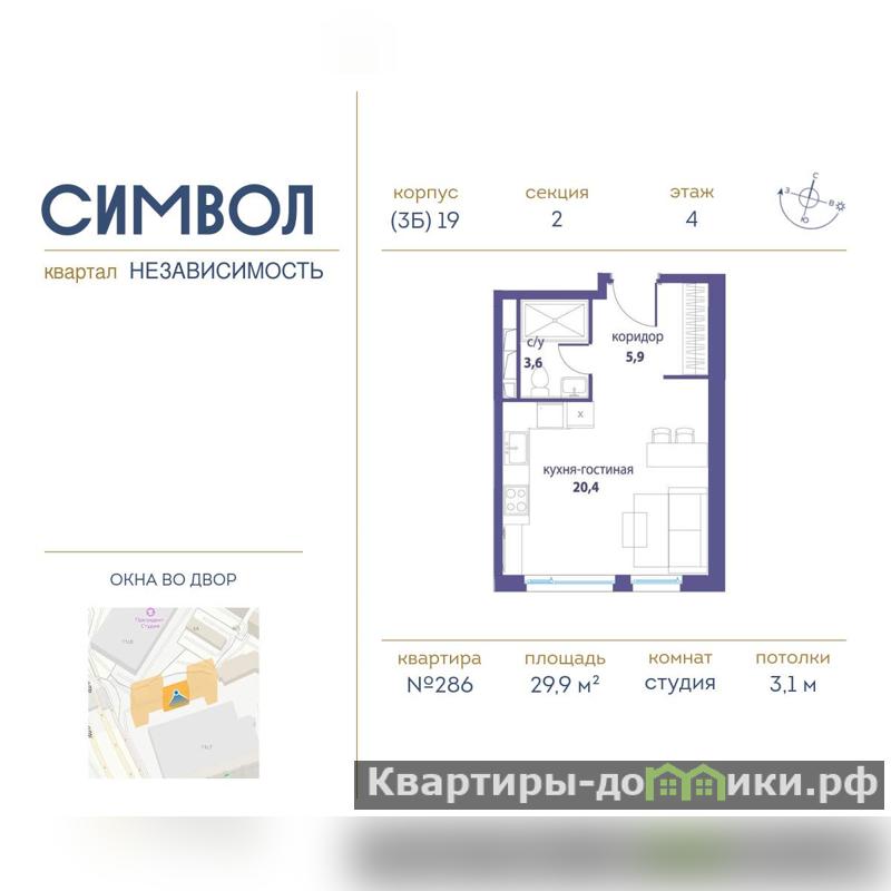 Продается студия-апартаменты в ЖК Символ на 4-м этаже. Общая площадь лота составляет 29.90 кв. м, из которых 10.00 кв. м отведено под гостиную и 10.40 кв. м отведено под кухонную зону. 1 совмещенный санузел.