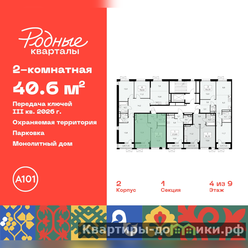 Просторная 2-комн. квартира с европланировкой в ЖК "Родные кварталы" на 4 этаже. Квартира без отделки, после выдачи ключей можно делать ремонт. Общая площадь: 40.6 кв.м., жилая: 25.8 кв.м., суммарная площадь гостиной-столовой с кухонной зоной: 17.5 кв.м. Европейская планировка, в просторной кухне-гостиной удобно как готовить, так и отдыхать. Комнаты изолированные, все окна выходят на одну сторону. В квартире одна лоджия, один совмещенный санузел. Высота потолков 2.9 м.
