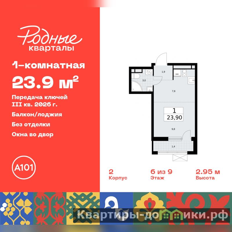 Однокомнатная квартира-студия в ЖК "Родные кварталы" на 6 этаже. Квартира без отделки, полностью готова к чистовой отделке и дальнейшему ремонту. Общая площадь: 23.9 кв.м., площадь гостиной 17.6 кв.м., из которых 7.8 кв.м. выделено под кухонную зону. Все окна выходят на одну сторону. В квартире один балкон, один совмещенный санузел. Высота потолков 2.9 м.