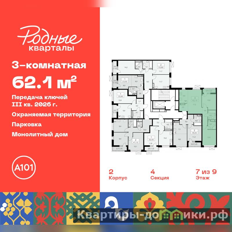 Продается 3-комн. квартира с европланировкой в ЖК "Родные кварталы" на 7 этаже. Квартира без отделки, после выдачи ключей можно делать ремонт. Общая площадь: 62.1 кв.м., жилая: 39.8 кв.м., суммарная площадь гостиной-столовой с кухонной зоной: 23.1 кв.м. Европейская планировка, за счет большой площади кухни-гостиной квартира выглядит просторной и очень удобна для жизни. Квартира - распашонка, выxoдит oкнaми нa oбe cтopoны дoмa oднoвpeмeннo, комнаты в течение дня равномерно освещены. В квартире одна лоджия, два совмещенных санузла. Высота потолков 2.9 м.