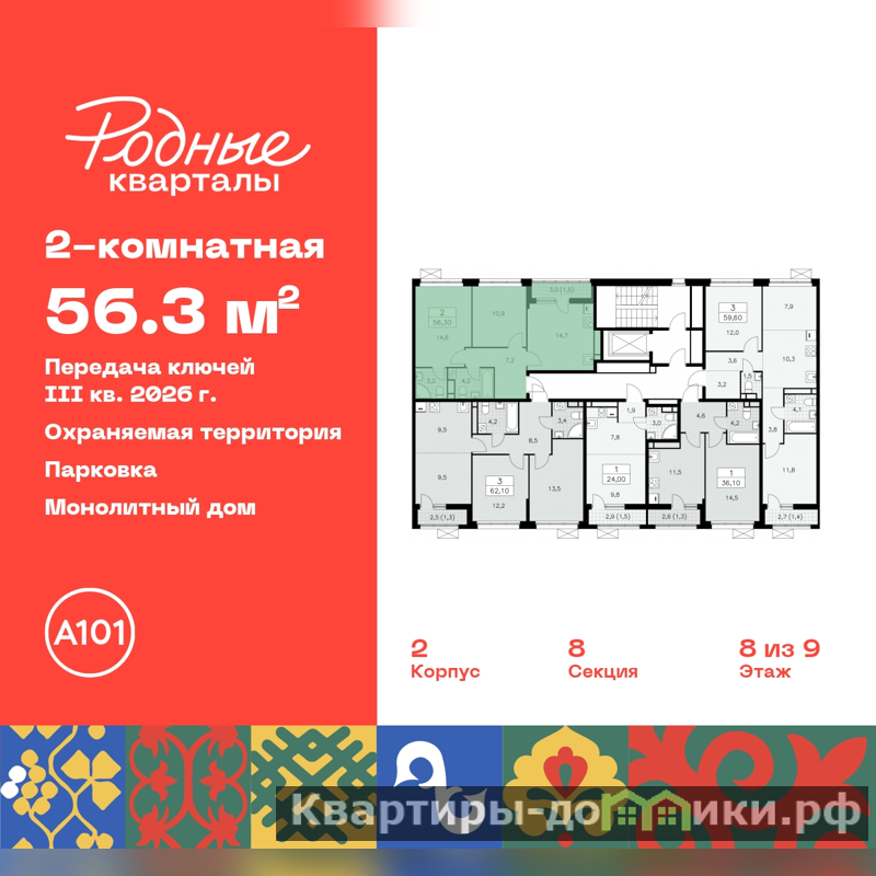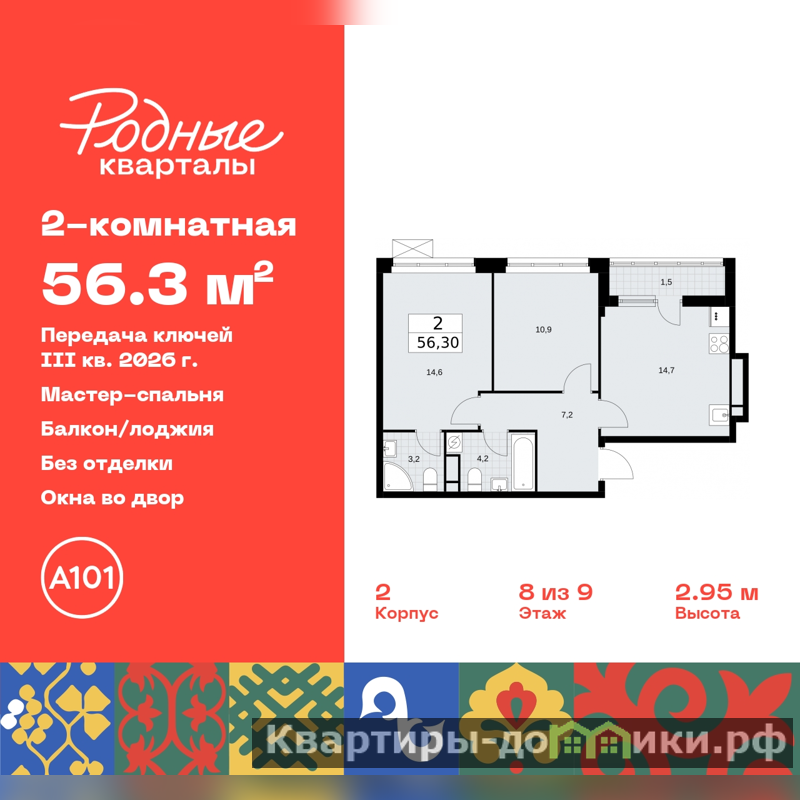 Продается 2-комн. квартира в ЖК "Родные кварталы" на 8 этаже. Квартира без отделки, новый собственник может сделать ремонт по индивидуальному дизайн-проекту. Общая площадь: 56.3 кв.м., жилая: 25.5 кв.м., площадь просторной кухни-столовой: 14.7 кв.м. Комнаты изолированные, все окна выходят на одну сторону. В квартире одна лоджия, два совмещенных санузла. Высота потолков 2.9 м.