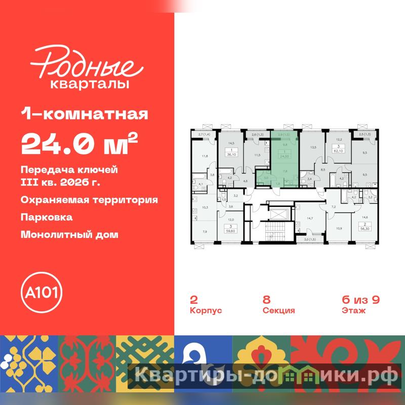 Однокомнатная квартира-студия в ЖК "Родные кварталы" на 6 этаже. Квартира без отделки, новый собственник может сделать ремонт по своему дизайн-проекту. Общая площадь: 24 кв.м., площадь гостиной 17.6 кв.м., из которых 7.8 кв.м. выделено под кухонную зону. Все окна выходят на одну сторону. В квартире один балкон, один совмещенный санузел. Высота потолков 2.9 м.