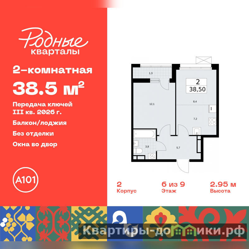 Двухкомнатная квартира с европланировкой в ЖК "Родные кварталы" на 6 этаже. Квартира без отделки, новый владелец может сделать ремонт по индивидуальному дизайн-проекту. Общая площадь: 38.5 кв.м., жилая: 20.5 кв.м., суммарная площадь гостиной-столовой с кухонной зоной: 15.6 кв.м. Европейская планировка, в просторной кухне-гостиной удобно как готовить, так и отдыхать. Комнаты изолированные, все окна выходят на одну сторону. В квартире одна лоджия, один совмещенный санузел. Высота потолков 2.9 м.