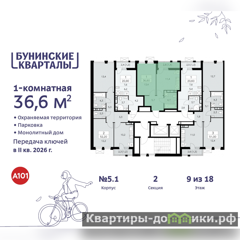 Дом монолитный, многоподъездный, переменной этажности, от 9 до 18 этажей. Квартира находится во 2-й секции высотой 18 этажей в корпусе 5.1. На этаже 5 квартир. В подъезде 1 пассажирский и 1 грузовой лифт. Начало строительства - 4 квартал 2023 года. Окончание строительства - 2 квартал 2026 года. Оформление сделки по договору долевого участия.