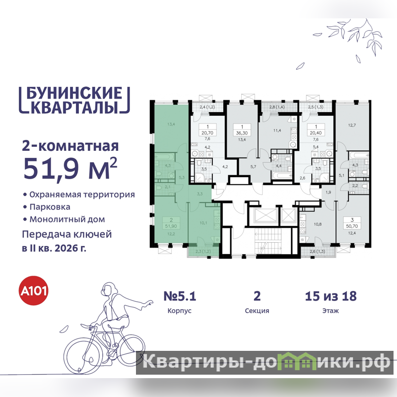 Дом монолитный, многоподъездный, переменной этажности, от 9 до 18 этажей. Квартира находится во 2-й секции высотой 18 этажей в корпусе 5.1. На этаже 5 квартир. В подъезде 1 пассажирский и 1 грузовой лифт. Начало строительства - 4 квартал 2023 года. Окончание строительства - 2 квартал 2026 года. Оформление сделки по договору долевого участия.