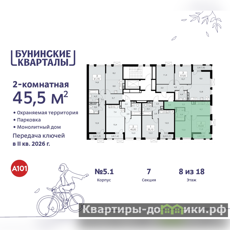 Дом монолитный, многоподъездный, переменной этажности, от 9 до 18 этажей. Квартира находится в 7-й секции высотой 9 этажей в корпусе 5.1. На этаже 5 квартир. В подъезде 1 грузовой лифт. Начало строительства - 4 квартал 2023 года. Окончание строительства - 2 квартал 2026 года. Оформление сделки по договору долевого участия.