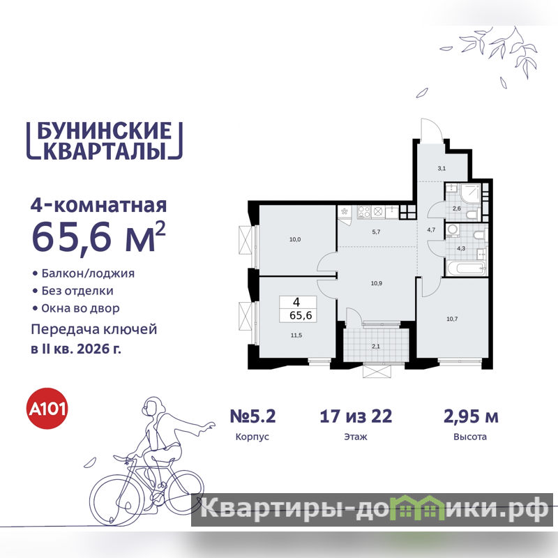 Продается четырехкомнатная квартира с европланировкой от застройщика в ЖК "Бунинские кварталы" на 17 этаже. Квартира без отделки, полностью готова к чистовой отделке и дальнейшему ремонту. Общая площадь: 65.6 кв.м., жилая: 43.1 кв.м., общая площадь гостиной-столовой с кухонной зоной: 16.6 кв.м. Европейская планировка, за счет большой площади кухни-гостиной квартира выглядит просторной и очень удобна для жизни. Угловая квартира, очень светлая, естественная вентиляция при открытии окон. В квартире одна лоджия, два совмещенных санузла. Высота потолков 2.95 м.