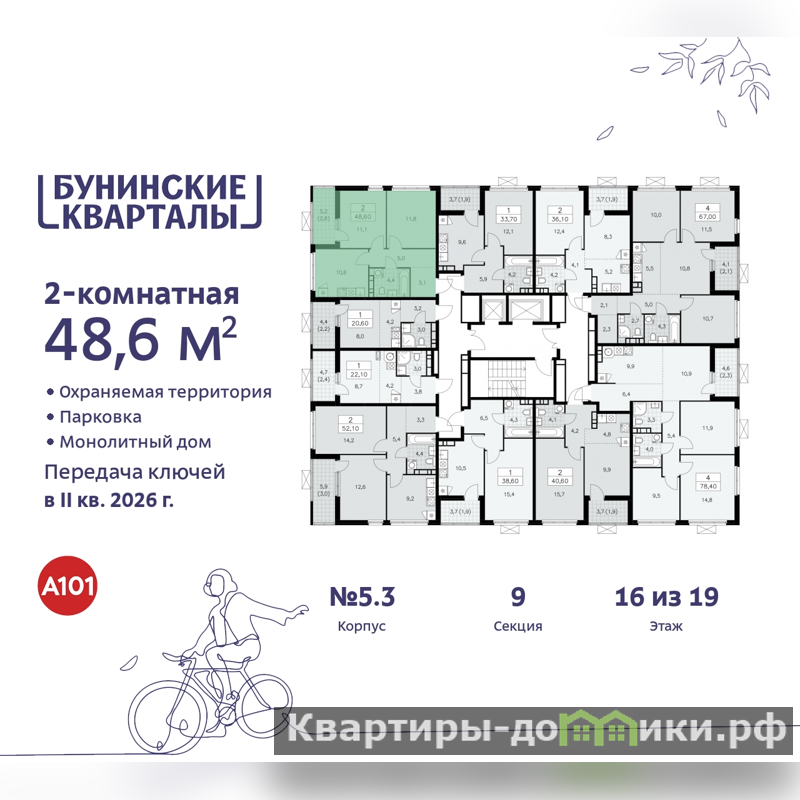 2-комн. квартира от застройщика в ЖК "Бунинские кварталы" на 16 этаже. Квартира без отделки, полностью готова к чистовой отделке и дальнейшему ремонту. Общая площадь: 48.6 кв.м., жилая: 22.9 кв.м., площадь просторной кухни-столовой: 10.6 кв.м. Угловая квартира, окна oбecпeчивaют paвнoмepнoe ocвeщeниe в тeчeниe дня. В квартире одна лоджия, один совмещенный санузел. Высота потолков 2.85 м.