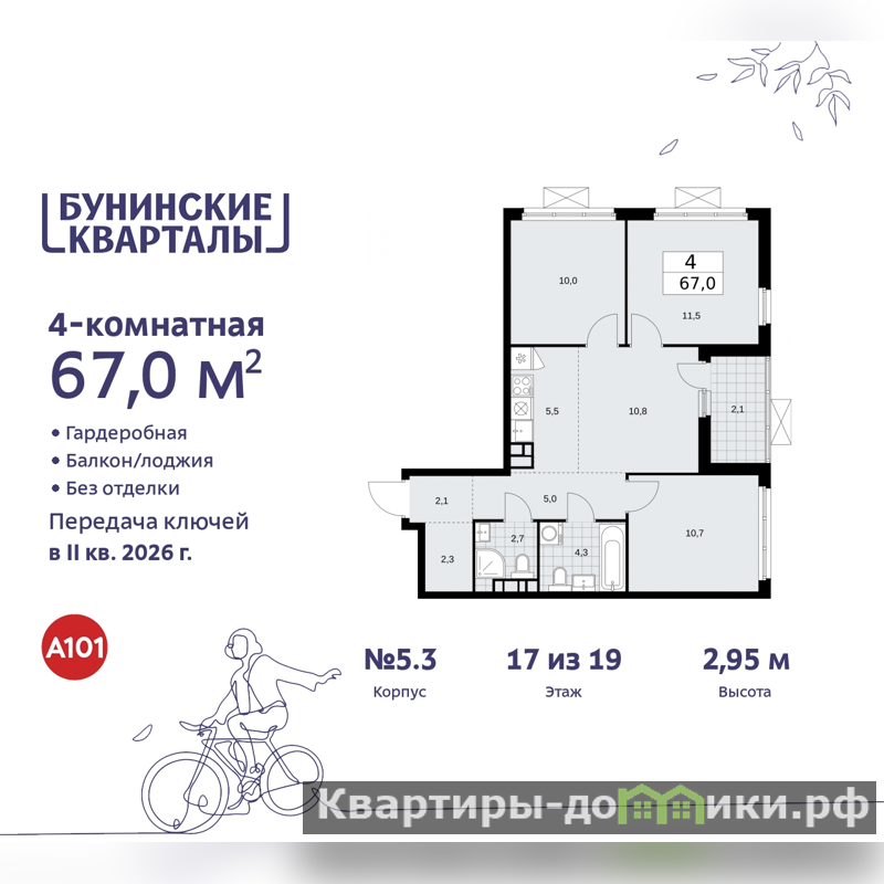 Просторная 4-комн. квартира с европланировкой в ЖК "Бунинские кварталы" на 17 этаже. Квартира без отделки, новый владелец может сделать ремонт по своему проекту. Общая площадь: 67 кв.м., жилая: 43 кв.м., общая площадь гостиной-столовой с кухонной зоной: 16.3 кв.м. Европейская планировка, зона гостиной комнаты объединена с кухней. Квартира угловая, очень светлая, естественная вентиляция при открытии окон. В квартире одна лоджия, два совмещенных санузла. Высота потолков 2.85 м.