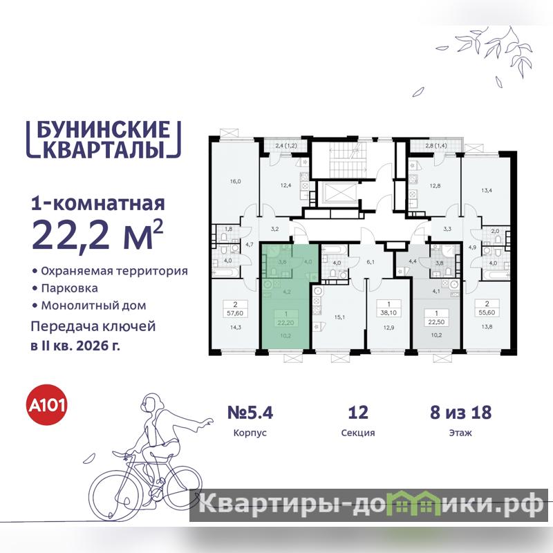 Просторная 1-комн. квартира-студия в ЖК "Бунинские кварталы" на 8 этаже. Квартира без отделки, новый владелец может сделать ремонт по своему проекту. Общая площадь: 22.2 кв.м., площадь гостиной 14.4 кв.м., из которых 4.2 кв.м. выделено под кухонную зону. Все окна выходят на одну сторону. В квартире один совмещенный санузел. Высота потолков 2.95 м.
