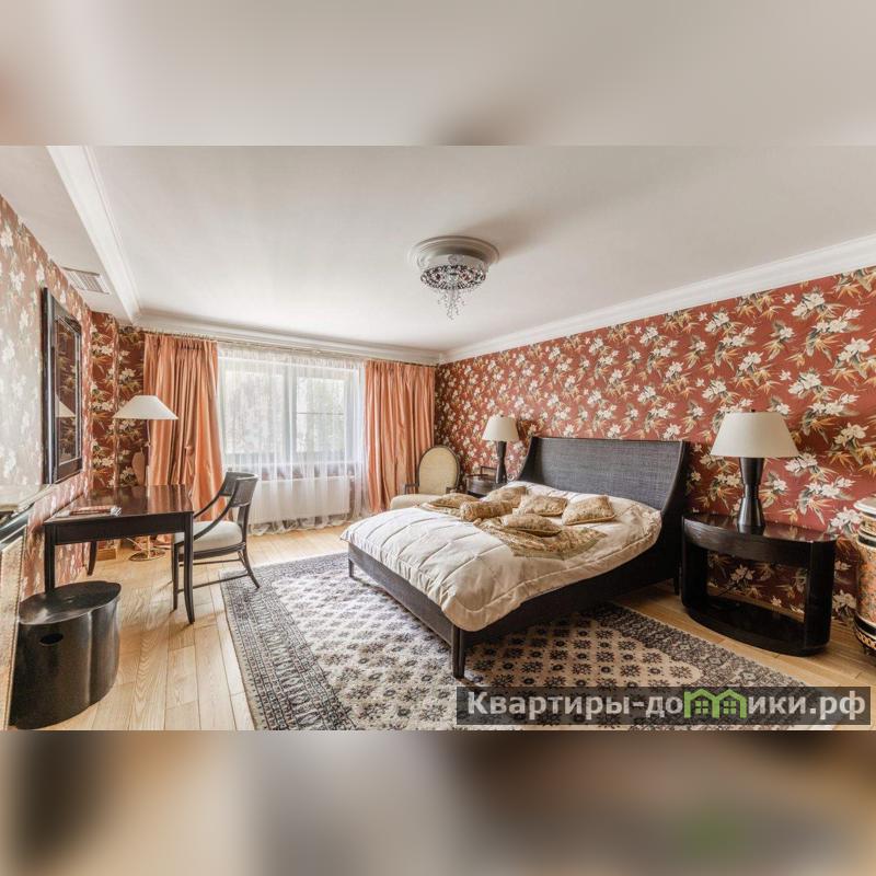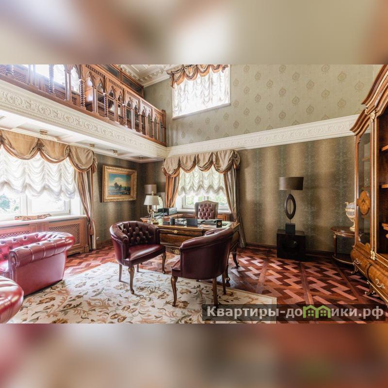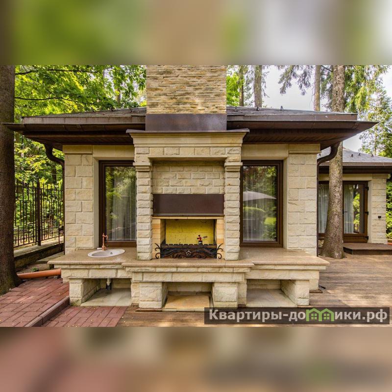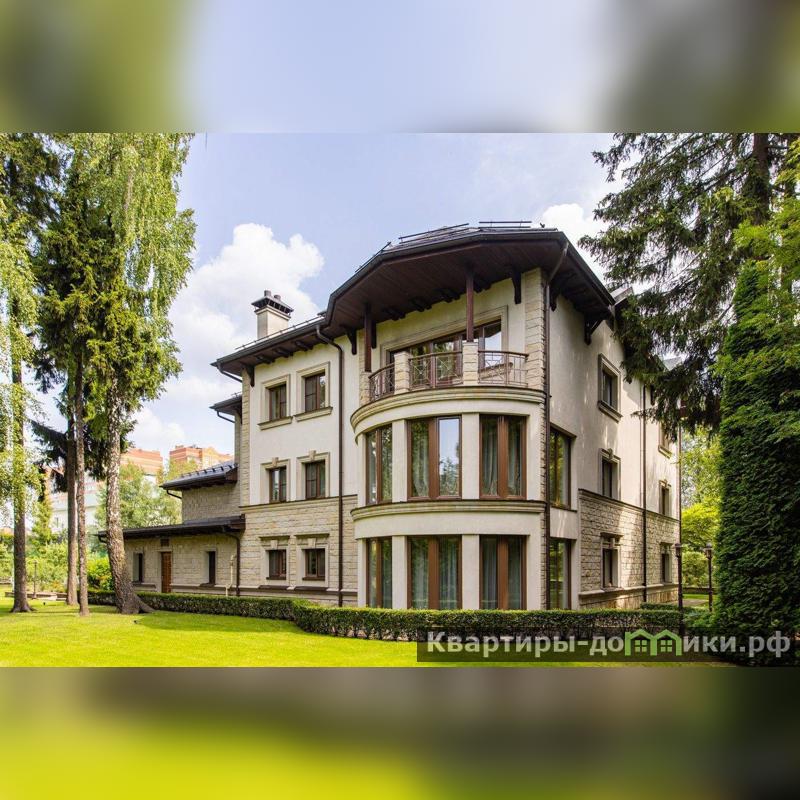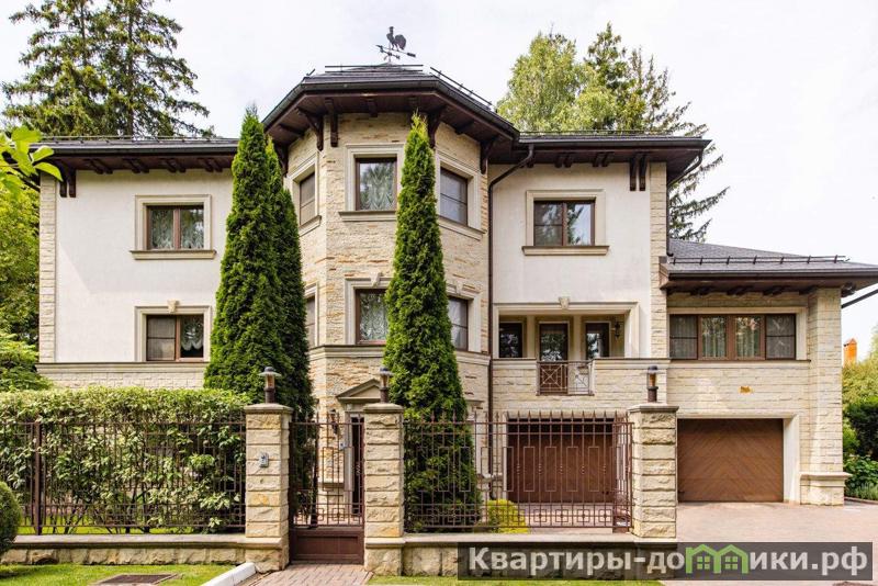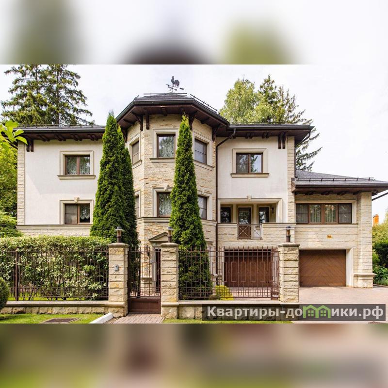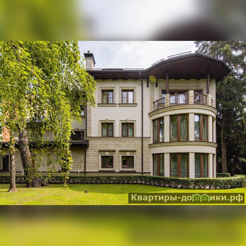 Роскошная загородная резиденция площадью 850 м расположена на просторном ухоженном участке 34 сотки рядом с лесом. Фасад в неоклассическом стилев бежевых тонах украшен рельефом камня и рустами. Фасад, выходящий на участок- с большим эркером и открытым балконом на третьем этаже.