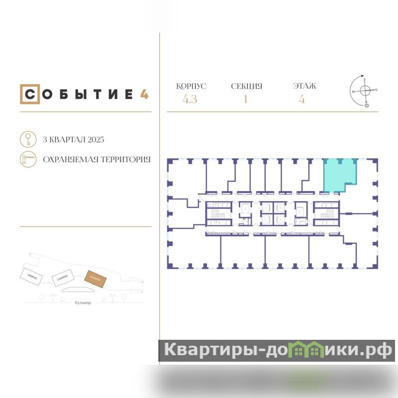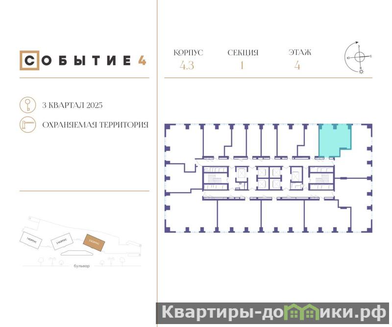 Квартира расположена в квартале 4, в корпусе 3 (секция 1) . В каждом подъезде запроектировано 5 квартир на этаж, есть пассажирский и грузовой лифты.