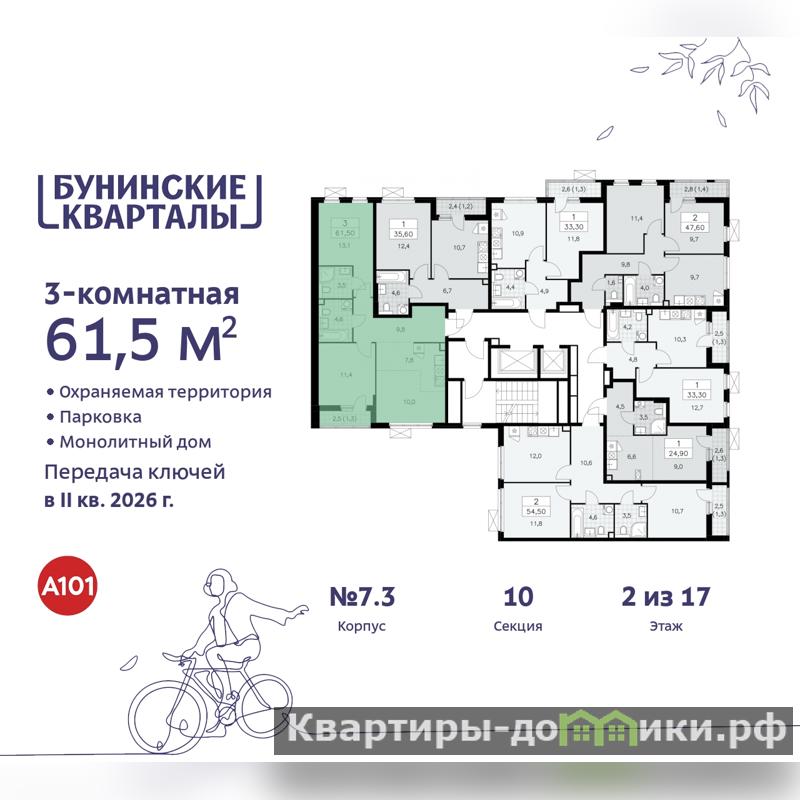 Продается 3-комн. квартира с европланировкой в ЖК "Бунинские кварталы" на 2 этаже. Квартира без отделки, полностью готова к чистовой отделке и дальнейшему ремонту. Общая площадь: 61.5 кв.м., жилая: 34.5 кв.м., общая площадь гостиной-столовой с кухонной зоной: 17.8 кв.м. Европейская планировка, кухня-гостиная - идеальный вариант для тех, кто любит часто принимать гостей. Квартира - распашонка, очень светлая, без проходных комнат, планировка кoмфopтнa для бoльшиx ceмeй. В квартире одна лоджия, два совмещенных санузла. Высота потолков 2.8 м.