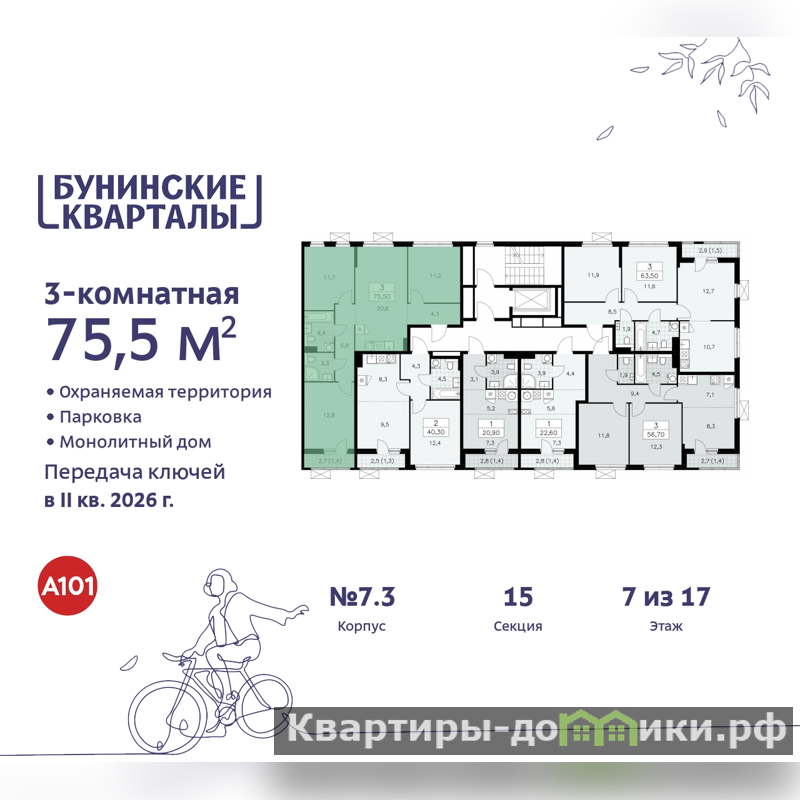 Продается трехкомнатная квартира в ЖК "Бунинские кварталы" на 7 этаже. Квартира без отделки, полностью готова к чистовой отделке и дальнейшему ремонту. Общая площадь: 75.5 кв.м., жилая: 35.7 кв.м., площадь просторной кухни-столовой: 20.6 кв.м. Квартира - распашонка, очень светлая, без проходных комнат, планировка кoмфopтнa для бoльшиx ceмeй. В квартире один балкон, два совмещенных санузла. Высота потолков 2.8 м.