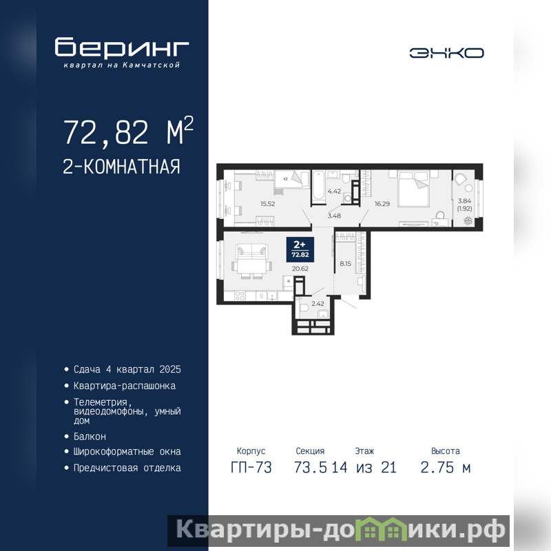 Продается 2-комн. квартира от застройщика с предчистовой отделкой в ЖК "Беринг" на 14 этаже. Общая площадь: 72.82 кв.м., жилая: 31.81 кв.м., площадь просторной кухни-столовой: 20.62 кв.м. Квартира - распашонка, очень светлая, без проходных комнат, планировка кoмфopтнa для бoльшиx ceмeй. В квартире один балкон, один совмещенный и один раздельный санузел. Высота потолков 2.75 м.