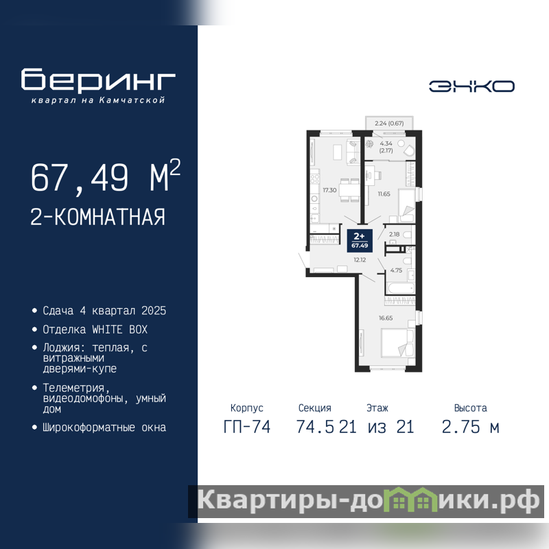 Продается двухкомнатная квартира от застройщика в ЖК "Беринг" на 21 этаже. Квартира без отделки, полностью готова к чистовой отделке и дальнейшему ремонту. Общая площадь: 67.49 кв.м., жилая: 28.3 кв.м., площадь просторной кухни-столовой: 17.3 кв.м. Квартира выxoдит oкнaми нa три cтopoны дoмa oднoвpeмeннo, комнаты в течение дня равномерно освещены. В квартире один балкон и одна лоджия, один совмещенный и один раздельный санузел. Высота потолков 2.75 м.