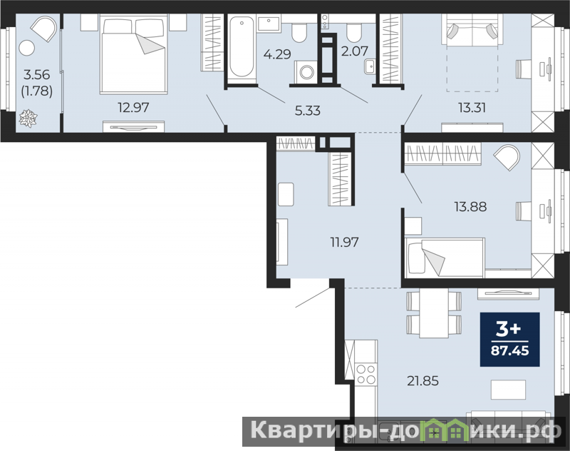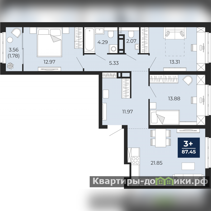 Продается 3-комн. квартира с предчистовой отделкой в ЖК "Беринг" на 17 этаже. Общая площадь: 87.45 кв.м., жилая: 40.16 кв.м., площадь просторной кухни-столовой: 21.85 кв.м. Квартира - распашонка, без проходных комнат, окна выходят на paзные стороны дома. В квартире один балкон, один совмещенный и один раздельный санузел. Высота потолков 2.75 м.