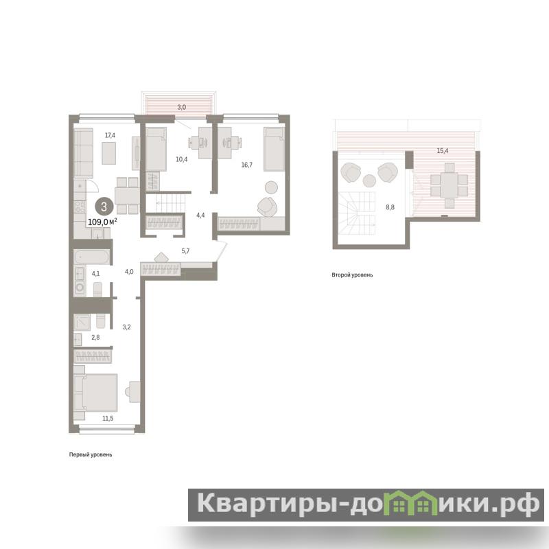 Двухуровневая квартира с кухней-гостиной и тремя спальнями в жилом районе Зарека. Особенности планировки: двухуровневая, вид во двор, разнесённые спальни, предчистовая отделка, летняя кухня на крыше, балкон, терраса на крыше.