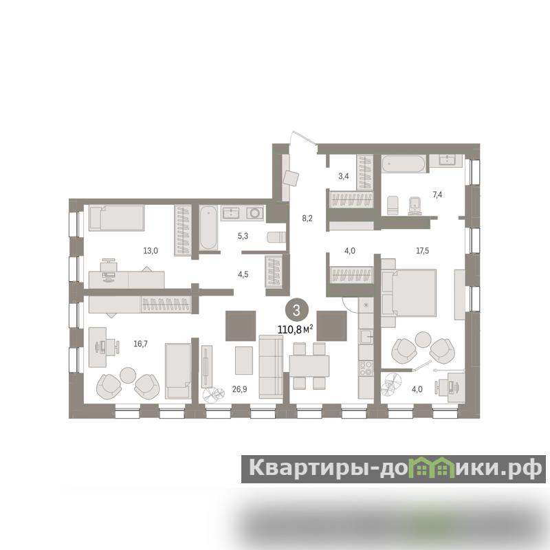 Квартира с кухней-гостиной и тремя спальнями в жилом районе Зарека. Особенности планировки: зенитное окно, окно в санузле, панорамное остекление, предчистовая отделка, мастер-спальня, семейная ипотека 4%, вид во двор, тёплая лоджия, разнесённые спальни.