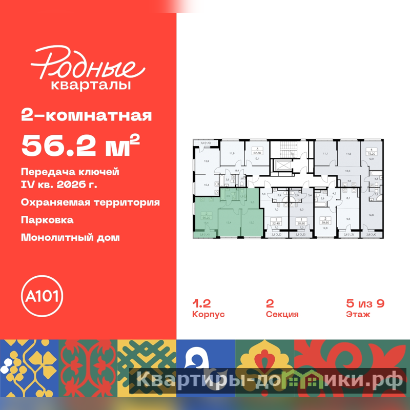 Продается 2-комн. квартира от застройщика с отделкой в ЖК "Родные кварталы" на 5 этаже. Общая площадь: 56.2 кв.м., жилая: 24.4 кв.м., площадь просторной кухни-столовой: 15.4 кв.м. Квартира угловая, идеально подойдет любителям тишины и панорамных видов. В квартире одна лоджия, один совмещенный и один раздельный санузел. Высота потолков 2.9 м.