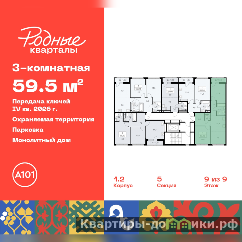 Дом монолитный, многоподъездный, высотой 9 этажей. Квартира находится в 4-й секции в корпусе 1.2. На этаже 5 квартир. В подъезде 1 грузовой лифт. Начало строительства - 4 квартал 2023 года. Окончание строительства - 4 квартал 2026 года. Оформление сделки по договору долевого участия.