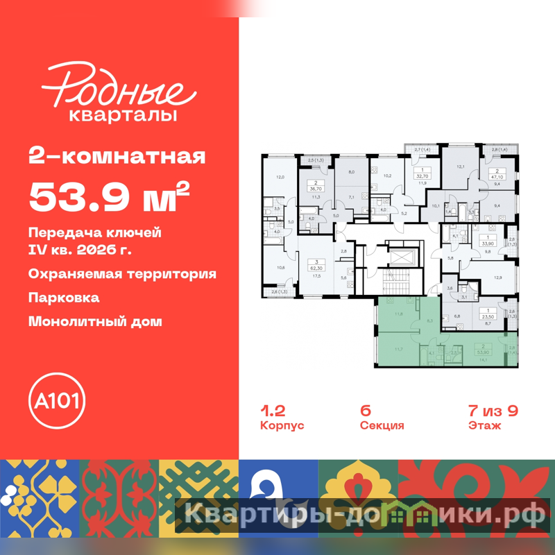 Дом монолитный, многоподъездный, высотой 9 этажей. Квартира находится в 5-й секции в корпусе 1.2. На этаже 7 квартир. В подъезде 1 грузовой лифт. Начало строительства - 4 квартал 2023 года. Окончание строительства - 4 квартал 2026 года. Оформление сделки по договору долевого участия.