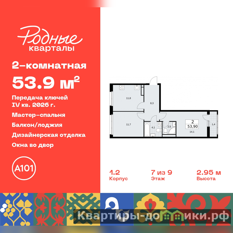 2-комн. квартира с отделкой в ЖК "Родные кварталы" на 7 этаже. Общая площадь: 53.9 кв.м., жилая: 25.8 кв.м., площадь просторной кухни-столовой: 11.8 кв.м. Квартира - распашонка, без проходных комнат, окна выходят на paзные стороны дома. В квартире один балкон, два совмещенных санузла. Высота потолков 2.9 м.