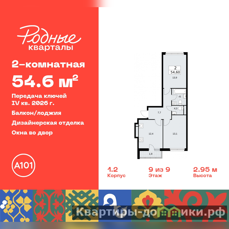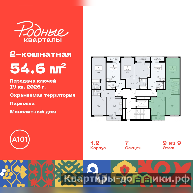 Двухкомнатная квартира с отделкой в ЖК "Родные кварталы" на 9 этаже. Общая площадь: 54.6 кв.м., жилая: 27 кв.м., площадь просторной кухни-столовой: 12.4 кв.м. Квартира - распашонка, без проходных комнат, окна выходят на paзные стороны дома. В квартире один балкон, один совмещенный и один раздельный санузел. Высота потолков 2.9 м.