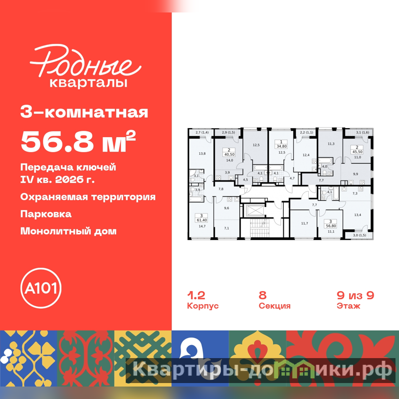 Трехкомнатная квартира с европланировкой и отделкой в ЖК "Родные кварталы" на 9 этаже. Общая площадь: 56.8 кв.м., жилая: 36.2 кв.м., общая площадь гостиной-столовой с кухонной зоной: 20.7 кв.м. Европейская планировка, площадь комнат позволяет разместить в них все необходимое, а в просторной кухне-гостиной удобно как готовить, так и отдыхать. Угловая квартира, идеально подойдет любителям тишины и панорамных видов. В квартире одна лоджия, один совмещенный санузел. Высота потолков 2.9 м.