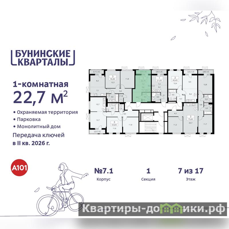 Однокомнатная квартира-студия от застройщика с отделкой в ЖК "Бунинские кварталы" на 7 этаже. Общая площадь: 22.7 кв.м., площадь гостиной 12.9 кв.м., из которых 5.6 кв.м. выделено под кухонную зону. Все окна выходят на одну сторону. В квартире один балкон, один совмещенный санузел. Высота потолков 2.8 м.