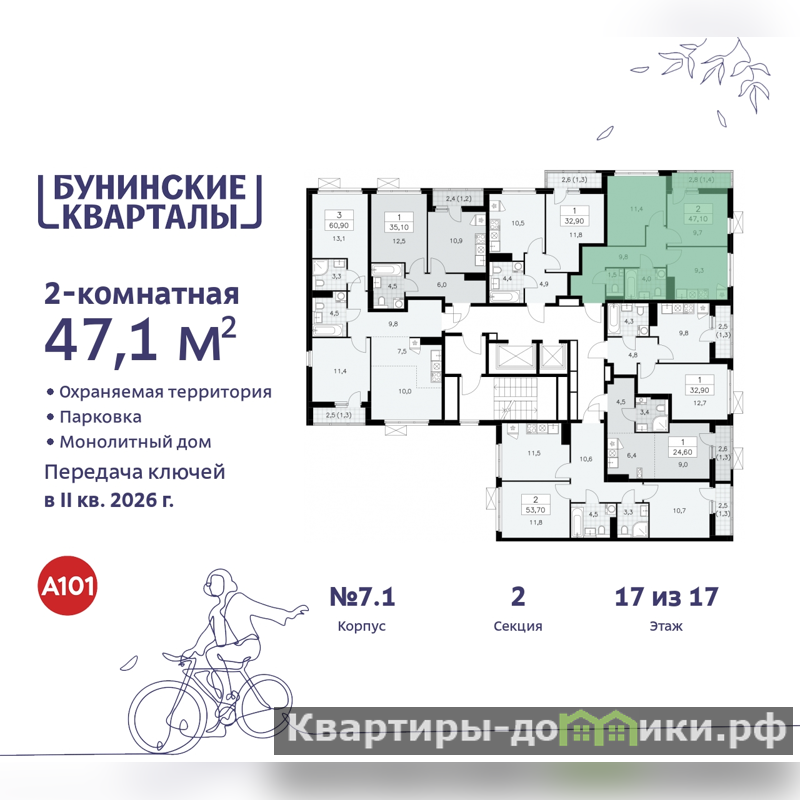 Дом монолитный, многоподъездный, переменной этажности, от 9 до 17 этажей. Квартира находится во 2-й секции высотой 17 этажей в корпусе 7.1. На этаже 7 квартир. В подъезде 1 пассажирский и 1 грузовой лифт. Начало строительства - 4 квартал 2023 года. Окончание строительства - 2 квартал 2026 года. Оформление сделки по договору долевого участия.